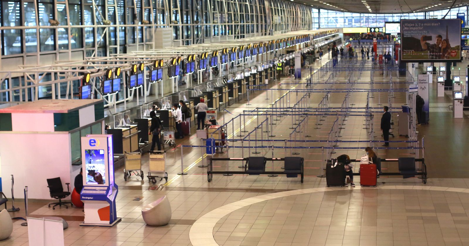 La imagen de este lunes en el aeropuerto de Santiago contrastó con la del domingo, cuando se registraron algunas aglomeraciones de viajeros saliendo del país en las horas previas del cierre de fronteras.