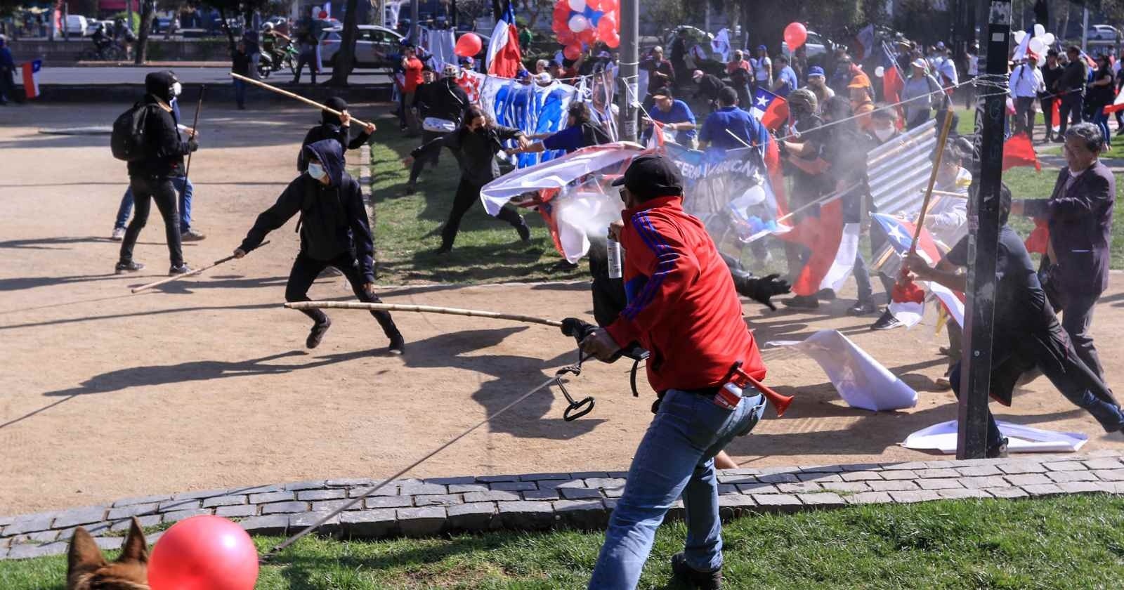 Según el capitán Emilio Hermosilla, de la 19° Comisaría de Providencia, explicó a T13 que “un grupo de aproximadamente 25 personas todas embozadas, portando palos, piedras y algunos otros elementos, irrumpieron en esta actividad para agredir a los manifestantes, provocándose desórdenes en el lugar”,