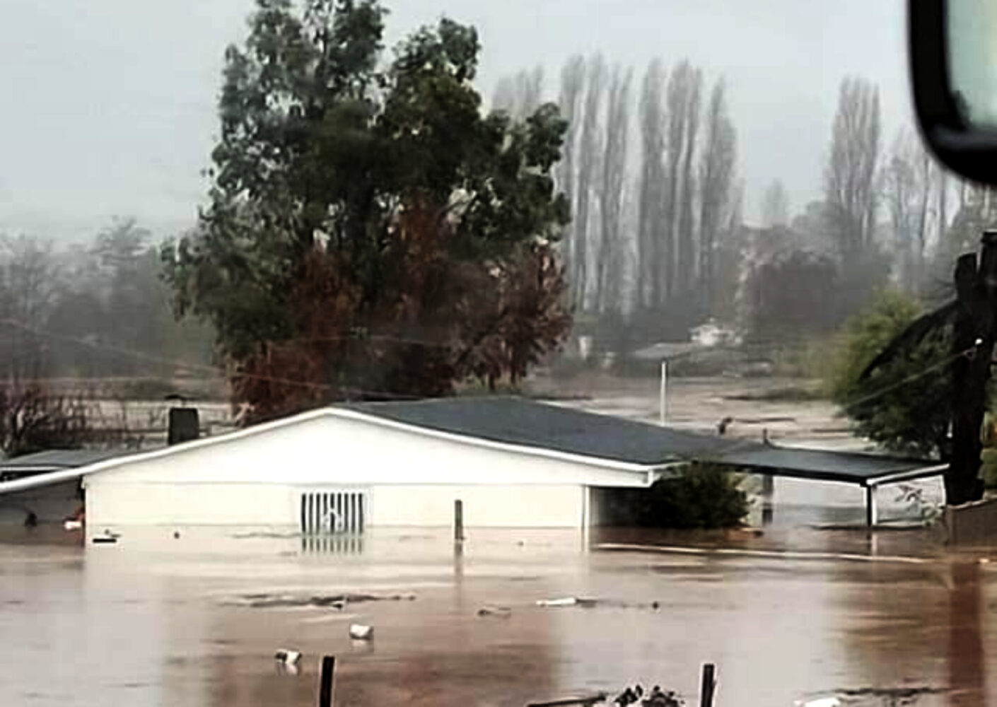 En algunas viviendas sanfernandinas el agua ha llegado prácticamente hasta el techo (imagen principal) y locales comerciales como el Sodimac de esta misma ciudad presentó serios problemas después de la salida del Río Tinguiririca. También el estacionamiento de un supermercado Líder.