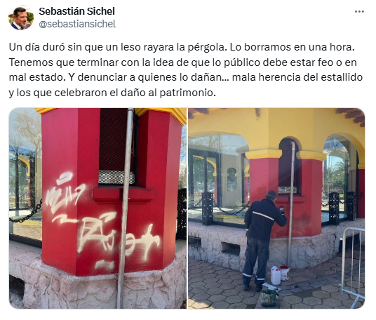 “Un día duró sin que un leso rayara la pérgola. Lo borramos en una hora. Tenemos que terminar con la idea de que lo público debe estar feo o en mal estado. Y denunciar a quienes lo dañan… mala herencia del estallido y los que celebraron el daño al patrimonio“, escribió en su cuenta de X.