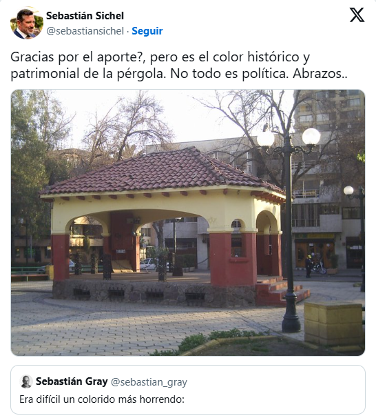 Sichel también empleó las redes sociales para responderle: “Gracias por el aporte, pero es el color histórico y patrimonial de la pérgola. No todo es política. Abrazos“.