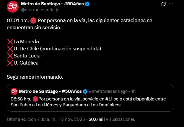 Este lunes 17 de noviembre, Metro de Santiago tuvo que cerrar cuatro estaciones de la Línea 1 en plena hora punta de la mañana debido a que una persona ingresó a las vías.
