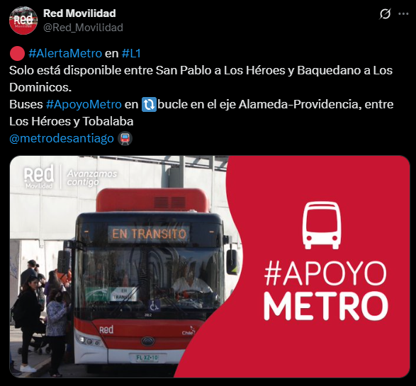 Junto a ello, el sistema RED anunció apoyo de buses en el eje Alameda-Providencia, entre Los Héroes y Tobalaba.