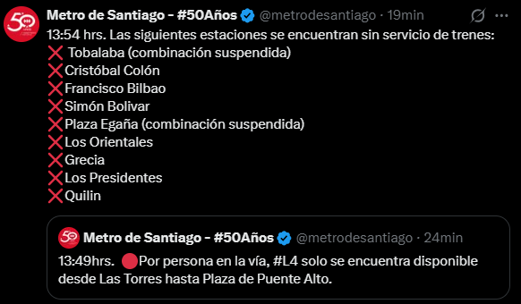 Mediante sus redes sociales, la empresa informó que nueve estaciones permanecen cerradas y que los trenes solo están operando entre Las Torres y Plaza de Puente Alto.