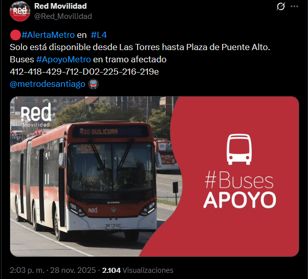 Junto a ello, Red Movilidad indicó que dispuso de buses de apoyo para los pasajeros que se desplazan por el tramo afectado con las líneas: