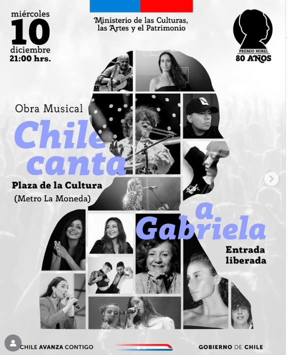 Este miércoles 10 de diciembre, a partir de las 21:00 horas, el Ministerio de las Culturas, las Artes y el Patrimonio presentará “Chile canta a Gabriela”, un espectáculo de gran formato en la Plaza de la Cultura, frente al Palacio de La Moneda.