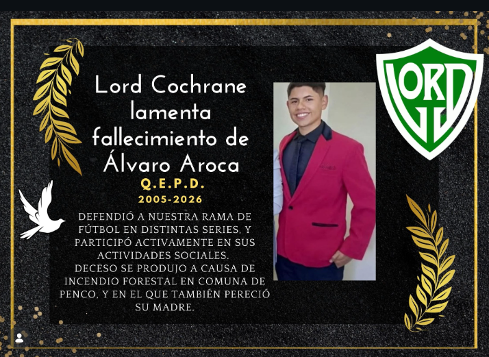 La Liga Deportiva Lord Cochrane CDS informó sobre el fallecimiento de Álvaro Aroca, jugador de su Rama de Fútbol, a causa del incendio forestal que afectó a la comuna de Penco, en la Región del Biobío.