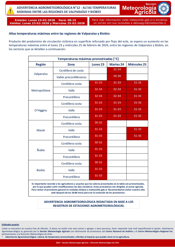 En O’Higgins, tanto en la cordillera de la costa como en el valle y la precordillera, se prevén temperaturas de hasta 33 °C durante todo el evento. En la región del Maule, en cambio, se anticipa una leve disminución de las máximas el martes.