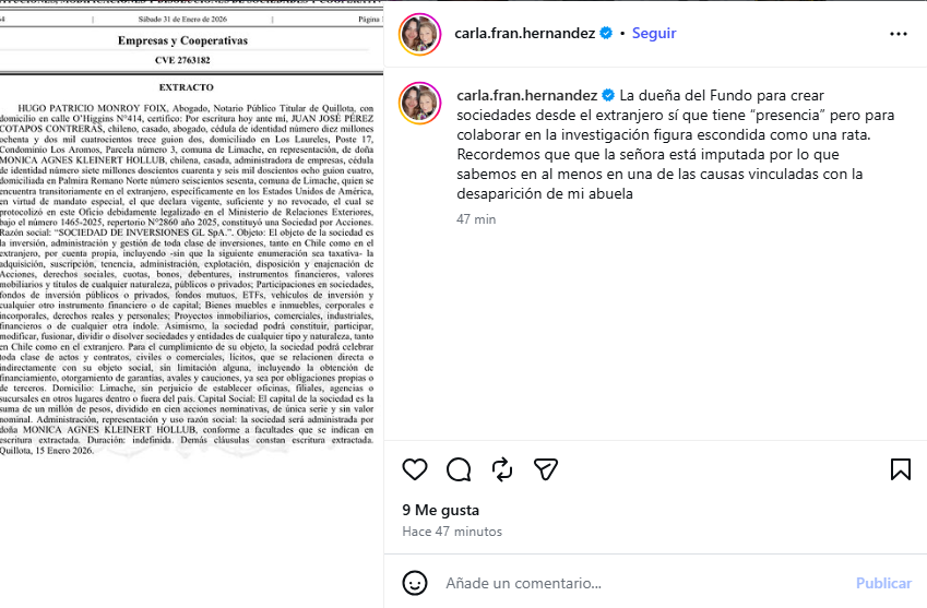 “La dueña del fundo para crear sociedades desde el extranjero sí que tiene presencia, pero para colaborar en la investigación figura escondida como una rata“, posteó Hernández en su cuenta de Instagram.