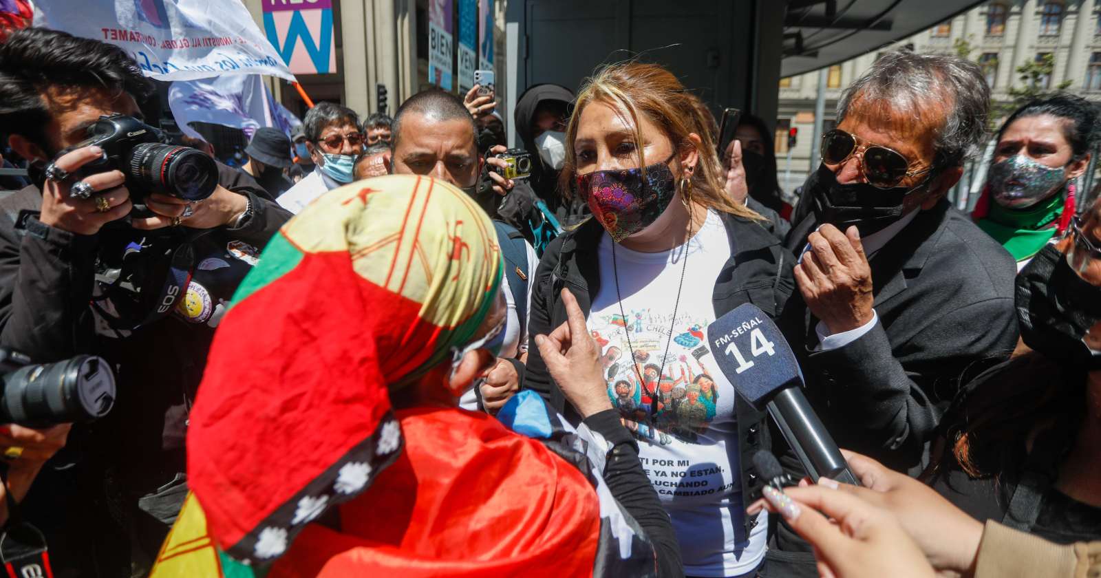 La ex representante de la Lista del Pueblo intentó dialogar con un grupo que se había instalado en las cercanías de la sede del órgano constituyente, hablando directamente con una mujer que portaba vestimenta y una bandera mapuche.
