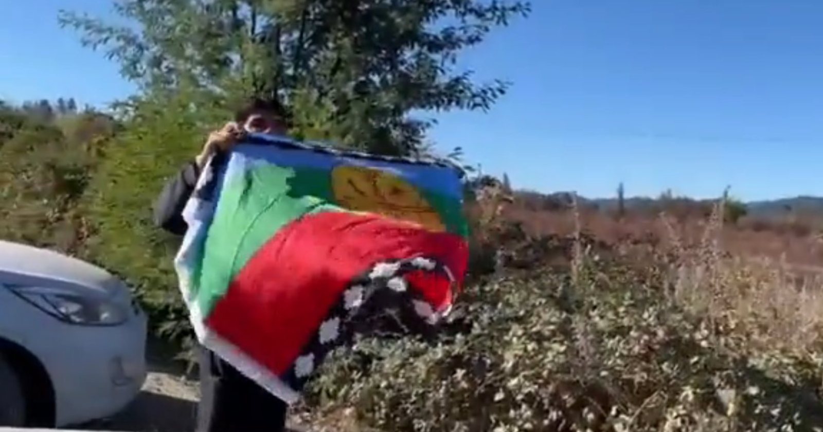 Ante esto, uno de los miembros del grupo se bajó de su vehículo y desplegó una bandera mapuche para buscar que los atacantes detuvieran su accionar, sin obtener resultados, por lo que la caravana desvió su camino hacia Ercilla para acudir al retén de Carabineros.