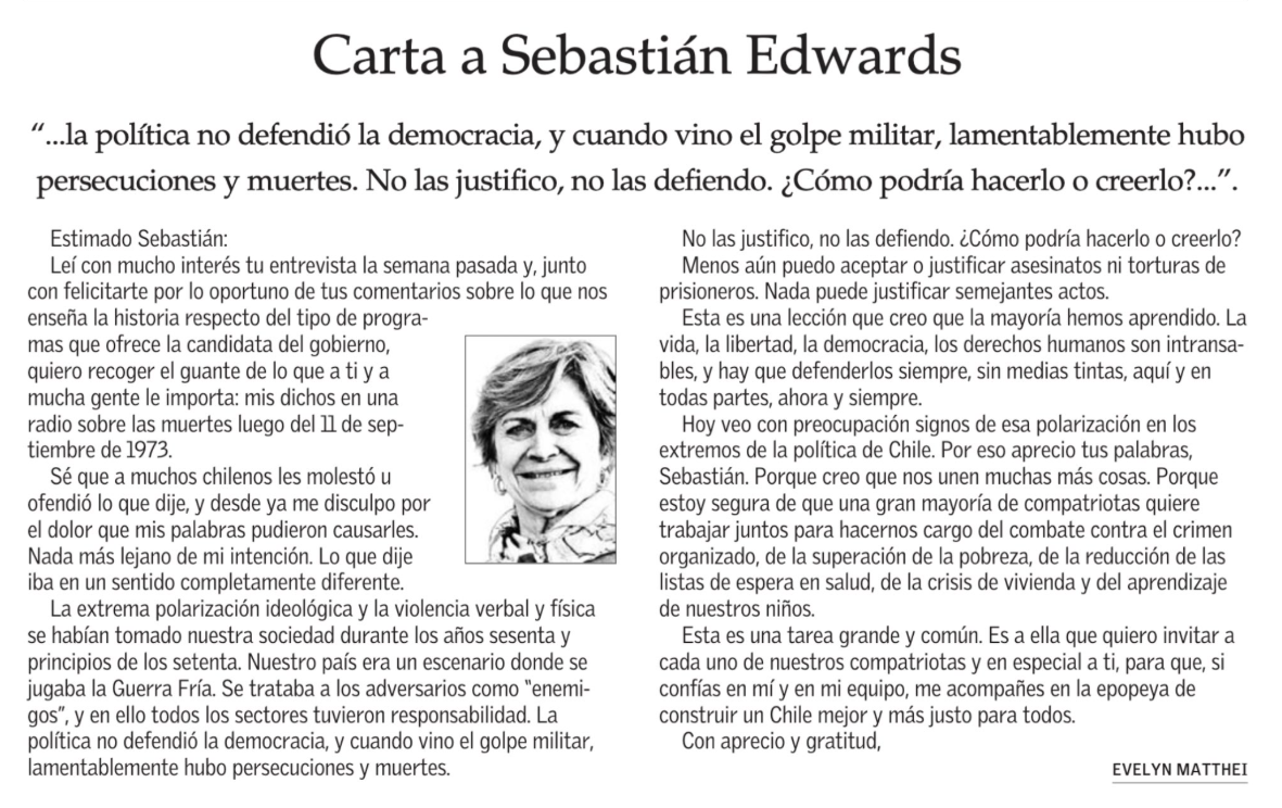 “Leí con mucho interés tu entrevista la semana pasada y, junto con felicitarte por lo oportuno de tus comentarios sobre lo que nos enseña la historia respecto del tipo de programas que ofrece la candidata del gobierno, quiero recoger el guante de lo que a ti y a mucha gente le importa: mis dichos en una radio sobre las muertes luego del 11 de septiembre de 1973“, comenzó indicando Matthei.