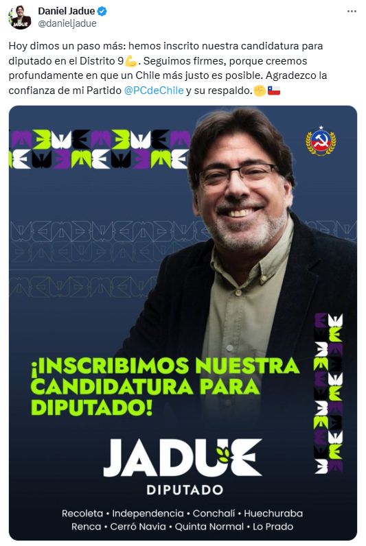 El ex jefe comunal empleó su cuenta en X para referirse a lo resuelto por la dirigencia que encabeza Lautaro Carmona, oportunidad en la que manifestó que “hoy dimos un paso más: hemos inscrito nuestra candidatura para diputado en el distrito 9“.