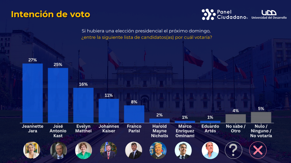 De acuerdo al sondeo, la candidata del oficialismo se ubica en el primer lugar con el 27% de las preferencias, subiendo dos puntos con respecto a la semana anterior. El abanderado del Partido Republicano se posiciona en el segundo puesto con 25%, sin mostrar variación en relación a la última encuesta.