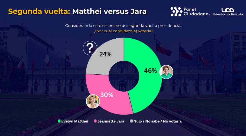 En caso de que en la segunda vuelta presidencial Jara se enfrente a Matthei, la carta de Chile Vamos la vencería con el 46% de respaldo contra el 30% de la ex ministra del Trabajo. Si este fuera el balotaje, un 24% se manifiesta indeciso.