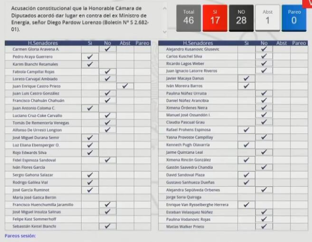 Este martes el Senado rechazó la acusación constitucional (AC) contra el ex ministro de Energía, Diego Pardow, luego de que no se alcanzara el quórum necesario.