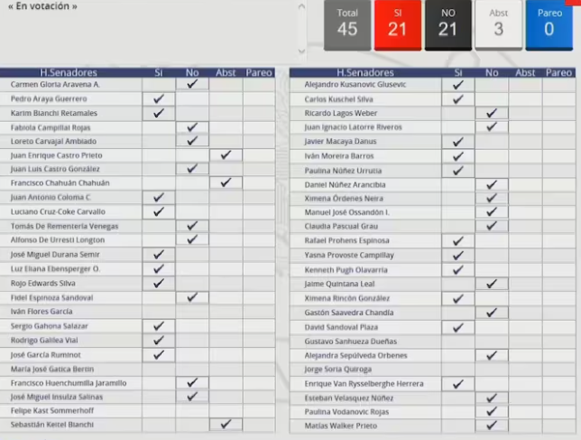 Pese a ello, la Sala del Senado rechazó los dos capítulos de la AC. La primera votación tuvo 28 votos en contra, 17 a favor y 1 abstención, mientras que la segunda tuvo 21 votos en contra, 21 a favor y 3 abstenciones.