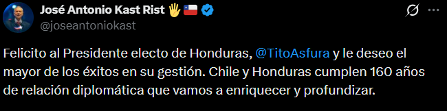 “Felicito al Presidente electo de Honduras, Nasry Asfura, y le deseo el mayor de los éxitos en su gestión. Chile y Honduras cumplen 160 años de relación diplomática que vamos a enriquecer y profundizar”, escribió Kast en una publicación en X sobre el resultado.