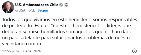 El diplomático empleó su cuenta en X para abordar las palabras del jefe de Estado chileno, quien a través de la misma red social se refirió a lo ocurrido luego de la captura del presidente de Venezuela, Nicolás Maduro, su esposa, Cilia Flores, y su posterior traslado a Nueva York.