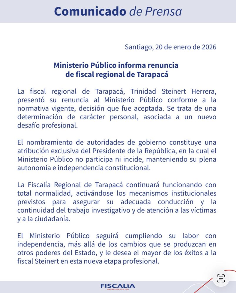 En medio de su inminente llegada al gabinete de Kast para ser ministra de Seguridad, el Ministerio Público informó la renuncia de Trinidad Steinert a través de un comunicado. “Se trata de una determinación de carácter personal, asociada a un nuevo desafío profesional”, detallaron.