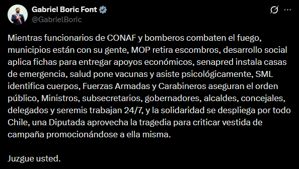 También a través de su cuenta en la mencionada red social, el presidente Gabriel Boric le respondió a Charpentier y dijo que “mientras funcionarios de Conaf y bomberos combaten el fuego, municipios están con su gente, MOP retira escombros, desarrollo social aplica fichas para entregar apoyos económicos, Senapred instala casas de emergencia, salud pone vacunas y asiste psicológicamente, SML identifica cuerpos, Fuerzas Armadas y Carabineros aseguran el orden público”.