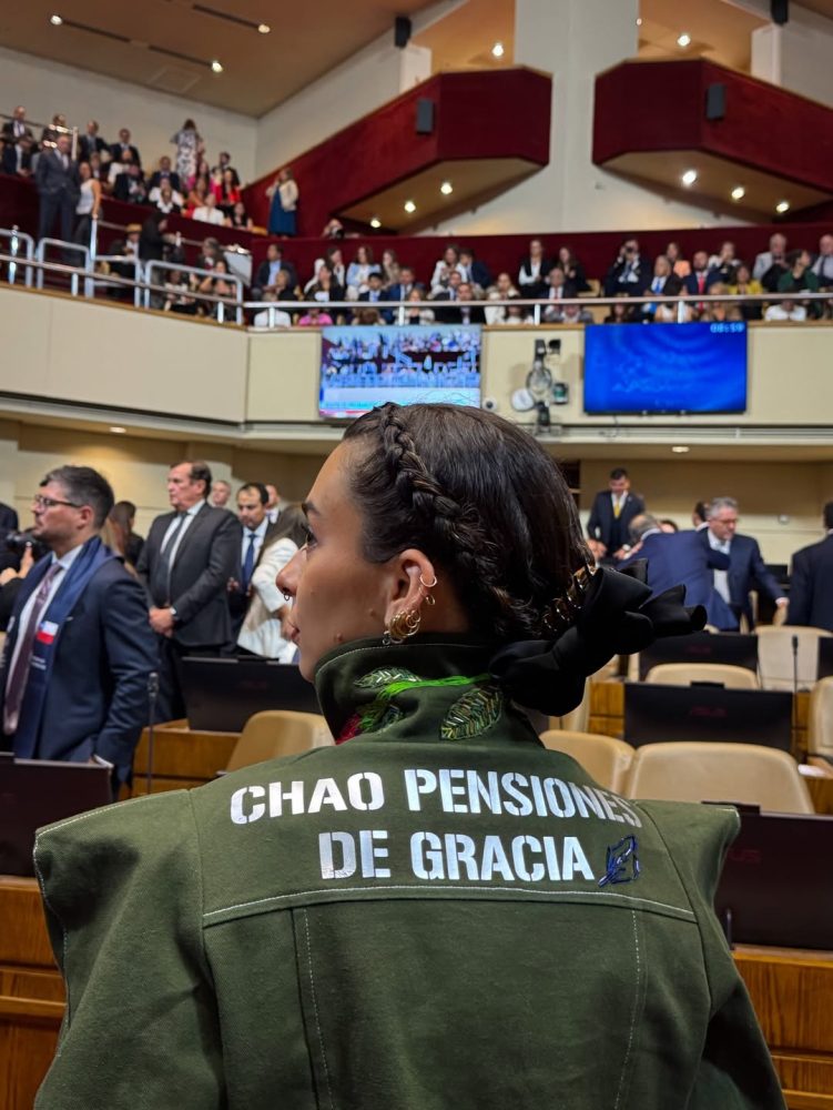 “Chao pensiones de gracia“, se pudo leer en la parte trasera de la chaqueta que llevaba la parlamentaria al prestar juramento en la Cámara Baja.