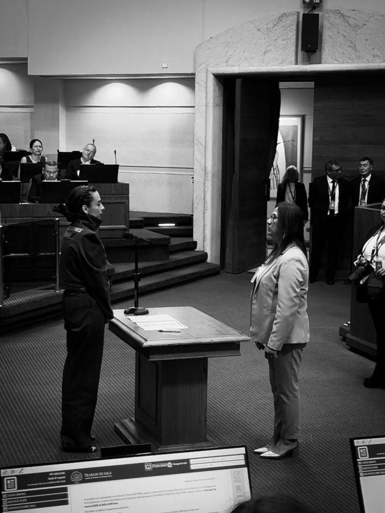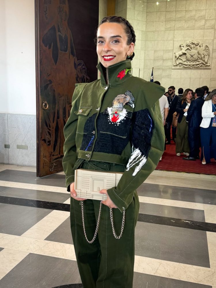 La legisladora, que desde este 11 de marzo se transformó en parlamentaria por el distrito 9 de la Región Metropolitana, lució un traje con los colores de la institución policial, con un mensaje en su espalda y un cóndor bordado en el frente.