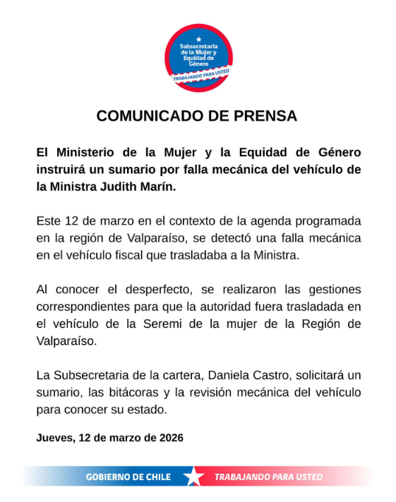 El Ministerio de la Mujer y la Equidad de Género anunció la apertura de un sumario administrativo luego de que el vehículo fiscal en que se trasladaba la ministra Judith Marín presentara una falla en sus frenos durante una actividad oficial en la Región de Valparaíso.