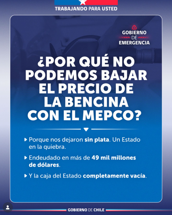 La discusión surgió luego de que, a través de redes sociales, el Ejecutivo explicara por qué no es posible reducir el valor de la bencina mediante el Mepco, planteando la interrogante “¿Por qué no podemos bajar el precio de la bencina con el Mepco?”.