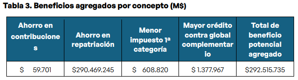 Lo anterior, considerando la rebaja al impuesto corporativo, la reintegración total del sistema tributario, una tasa rebajada para la repatriación de capitales y la exención de contribuciones. En caso de que se aprueben estas cuatro medidas, implicaría un beneficio patrimonial total de $292.515 millones para las autoridades.