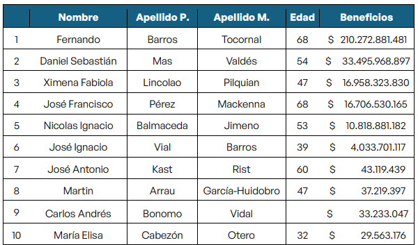 El 98,8% del beneficio total agregado (M$292.515.734) corresponde a sólo seis personas, y de esas, el ministro Fernando Barros representa más del 70% por sí solo gracias a la repatriación. Por este punto, el estudio proyecta un ahorro personal de $209.994.189.490 por una única vez.