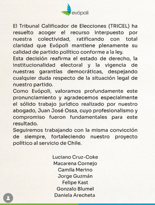 El Tribunal Calificador de Elecciones (Tricel) resolvió de forma unánime revocar la disolución del partido Evolución Política (Evópoli), dejando sin efecto la decisión del Servicio Electoral (Servel) que había ordenado su cancelación del Registro de Partidos Políticos.