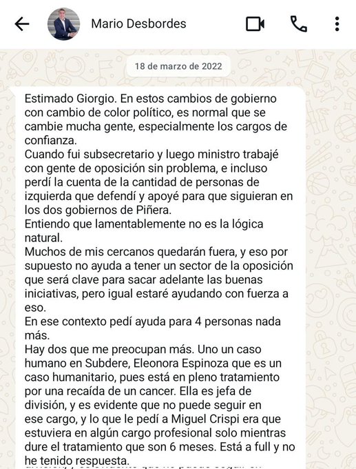 Sin embargo, Crispi le respondió a Desbordes: “Mario, sabes bien que la renuncia fue puesta a disposición y aceptada el 28 de febrero por el gobierno anterior. Días después de asumir, cuando recibí tu mensaje te llamé personalmente, me dijiste que su situación laboral ya estaba resuelta. No entiendo la polémica que intentas armar”.
