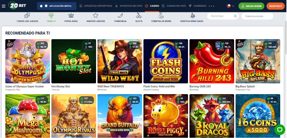 - 20Bet – 9.5/10 – Mejor para casino y apuestas en pesos chilenos