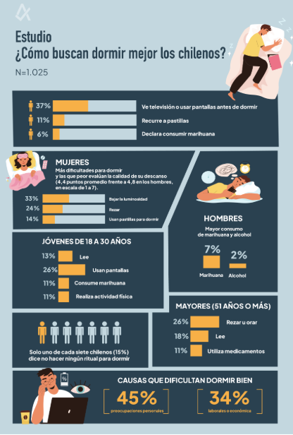 Junto a ello, un 11% de los encuestados recurre a pastillas y un 6% consume marihuana para lograr descansar.
